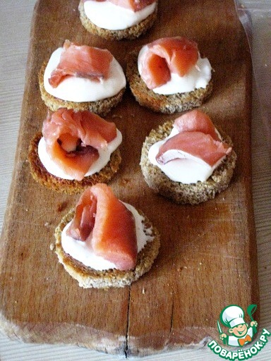 Намазать поджаренный хлеб чесночным кремом. И уложить сверху рыбу.