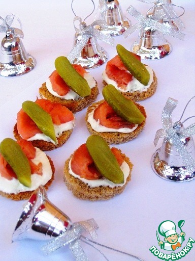 Корнишоны разрезать на две половины и выложить сверху рыбы. Две быстрые и вкусные закуски готовы.