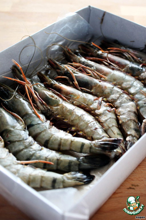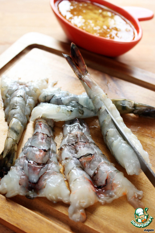 Креветки к этому времени уже должны быть хорошо разморожены. Лучше всего оставить их размораживаться на ночь в холодильнике. Очистить креветки от головы и панциря, оставив хвостик. Удалить темную кишечную вену.