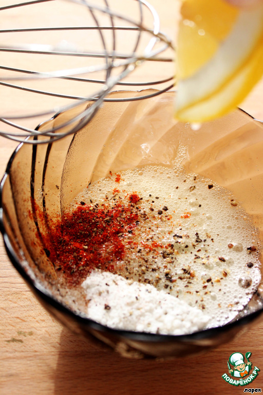На сковороде накалить растительное масло, огонь уменьшить до среднего. Взбить белок одного яйца в пену, добавить лимонный сок, крахмал, паприку, табаско и соль.