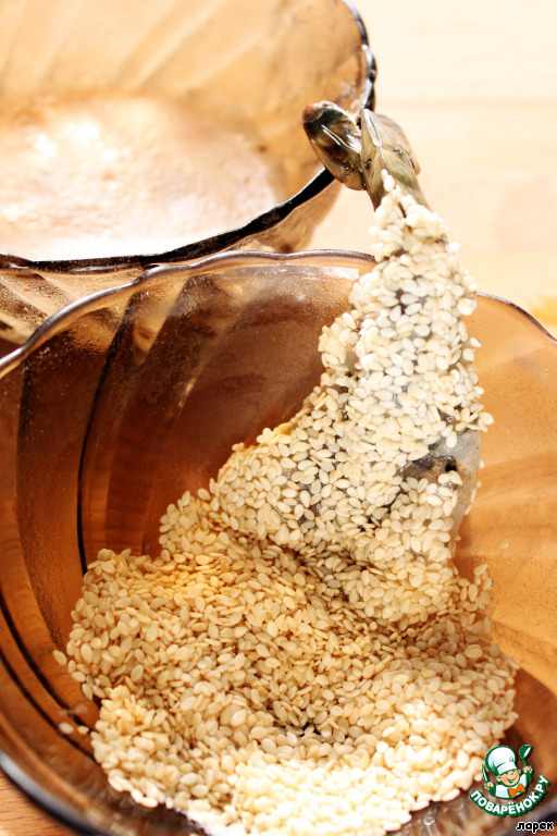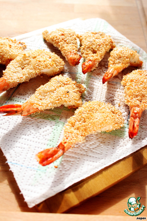 Совет - не насыпайте в тарелку сразу весь кунжут. Он быстро промокает от белка и плохо прилипает к креветкам. Добавляйте его понемногу, а еще лучше просто присыпайте кунжут сверху на креветку, держа ее над тарелкой.