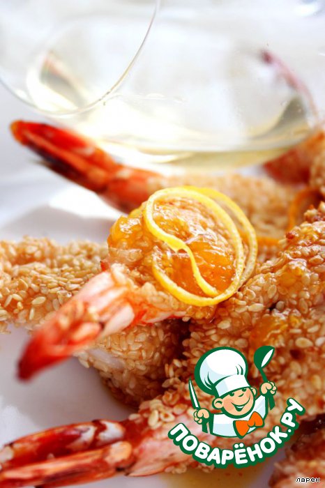 | Восхитительный дуэт - креветки в хрустящей кунжутной панировке и апельсиновый соус. Рекомендую! Исключительно хорошо сочетается с белым сухим вином. Соус советую взять на заметку. Подойдет не только к морепродуктам, но и к рыбе, курице. Рецепт La Perla, ЖЖ |