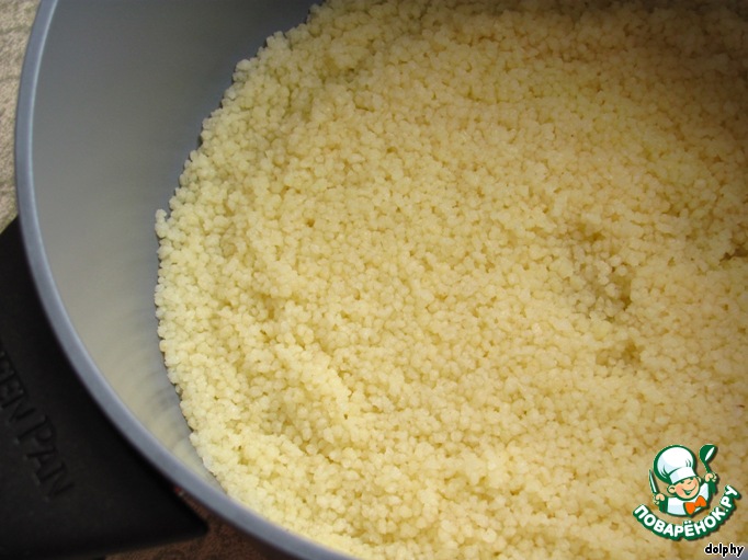 Кус-кус залейте 1/4 стак. горячей воды и оставьте на 5 минут. Дайте полностью остыть.