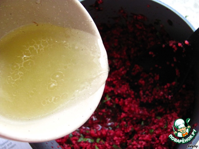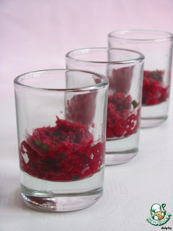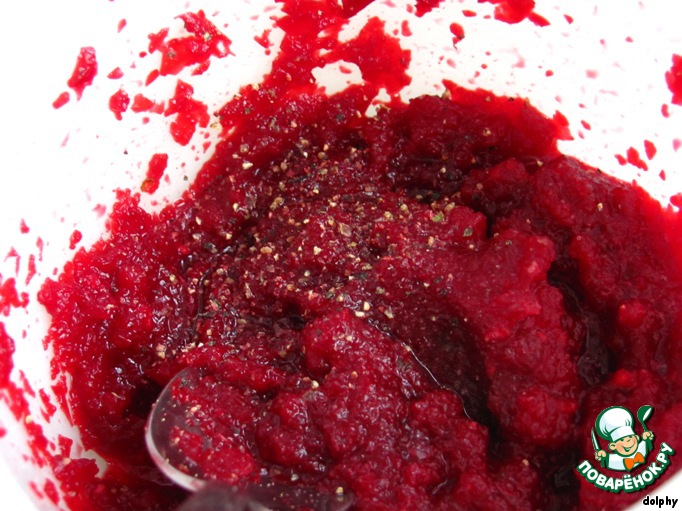 Оставшуюся свеклу превратите в пюре с 1 маленьким зубчиком чеснока. Посолите, поперчите.