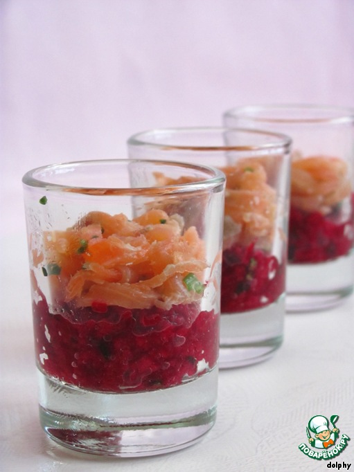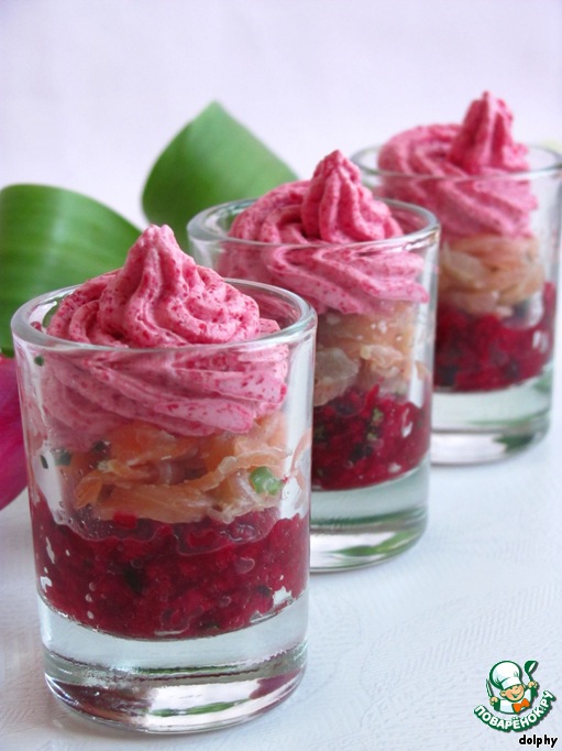 Свекольный мусс переложите в кулинарный кулек и увенчайте каждый веррин красивой розочкой.