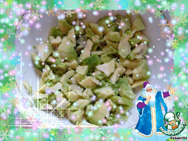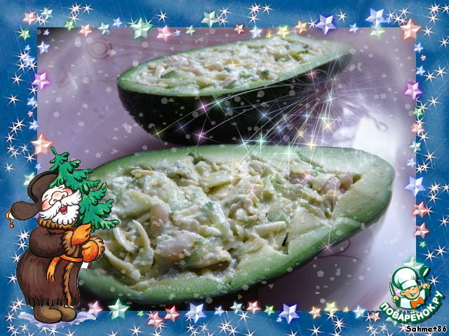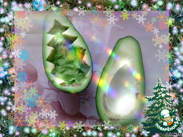 Выкладываем получившийся салат в половинки авокадо так чтобы оставались видны контуры елочки. Можно сделать объемную елочку, либо сверху добавить еще слой майонеза.