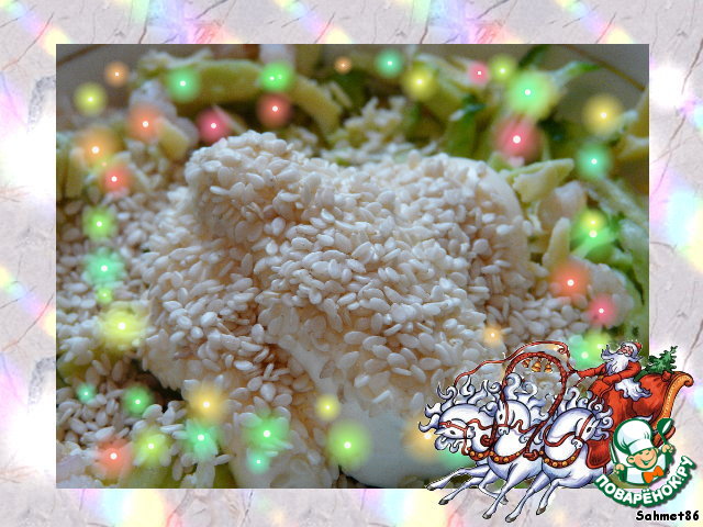 Все ингредиенты смешиваем, добавляем кунжут, сбрызгиваем соевым соусом и заправляем сметанно-майонезной смесью.