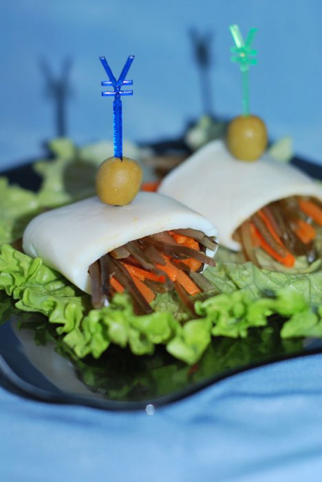А далее просто начиняем кальмар маринованной морской капустой и острой морковью по-корейски.