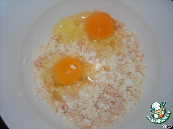 Добавляем яйца, перемешиваем. Добавляем зелень и перец и снова перемешиваем.