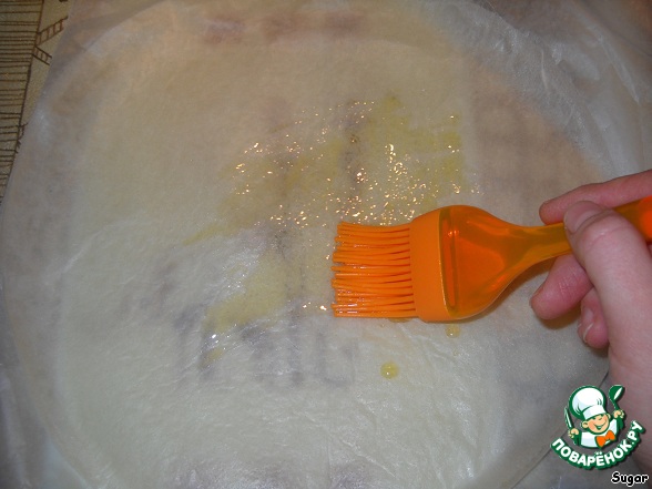 Лист теста фило (у меня круглый лист 34 см в диаметре, всего 8 листов теста фило) разрезаем на две части и смазываем его оливковым маслом.