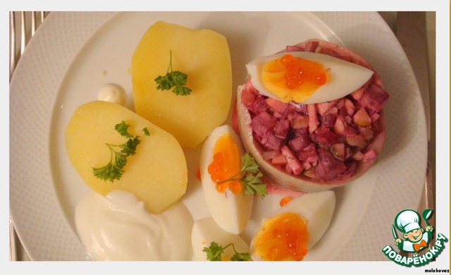Аккуратно снять кольцо. Я подавала с отварным картофелем и яйцами, украшенными икрой! По-моему, смотрится неплохо!