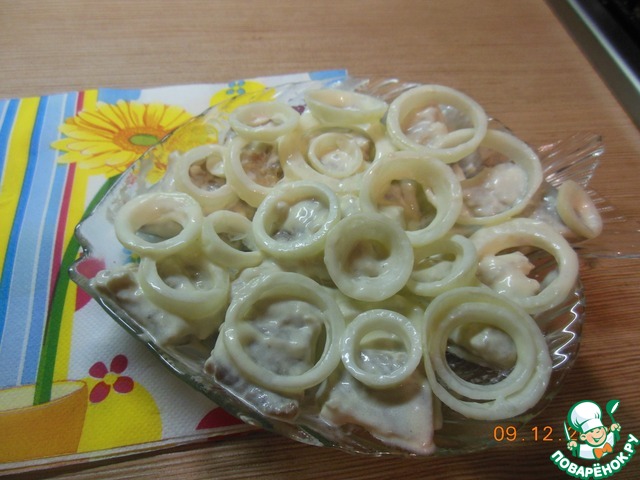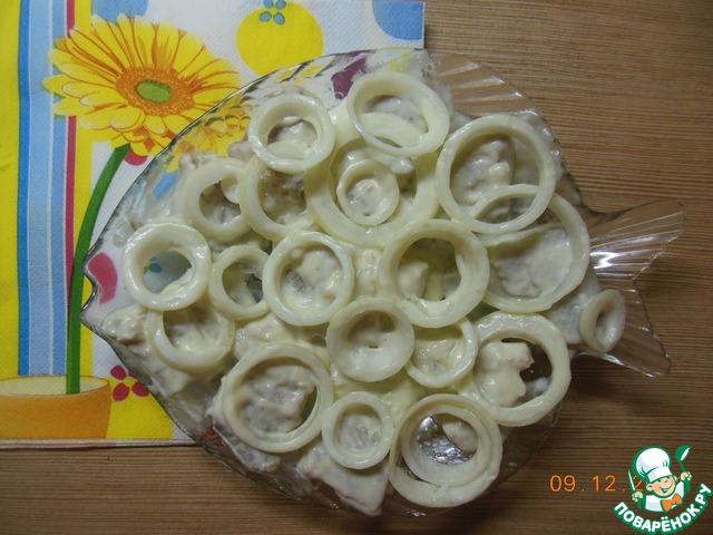 Выкладываем сверху наш лук. Аккуратно всё перемешаем. Отправляем в холодильник. Через сутки наша селёдка готова!