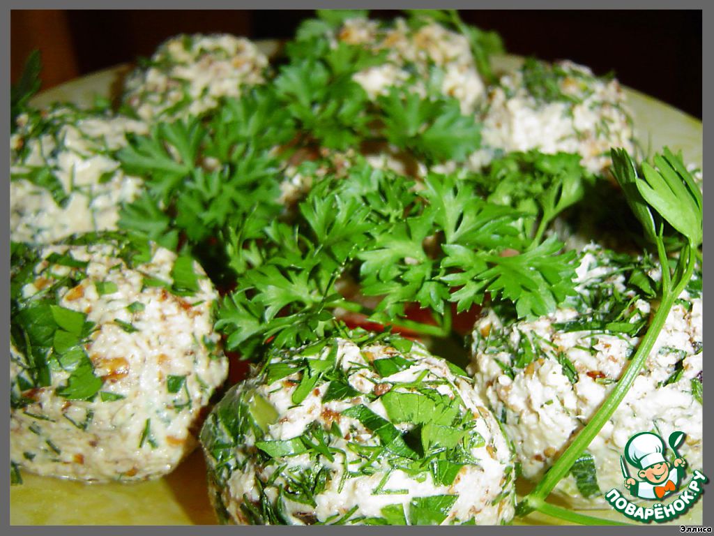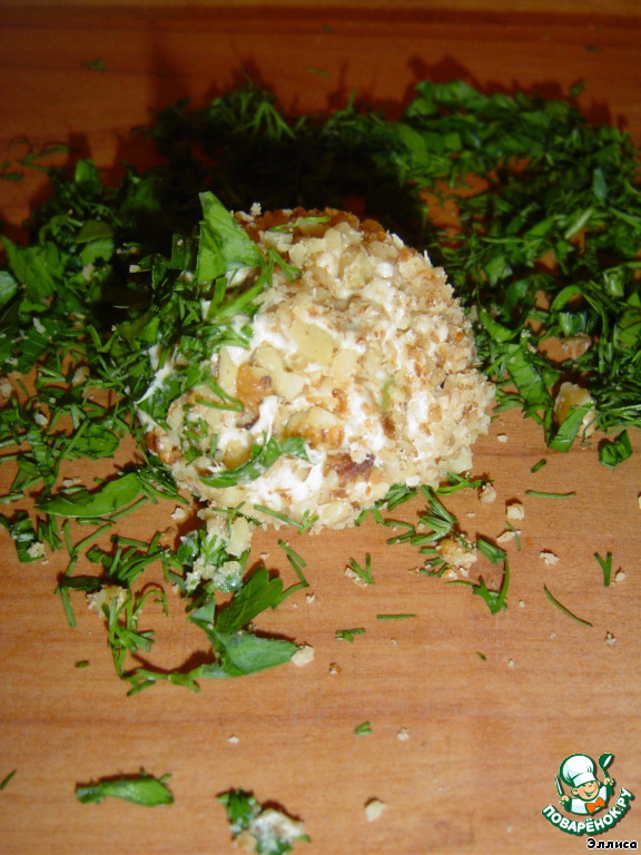 Готовые шарики обваливаем в измельченных орехах, а затем в измельченной петрушке.