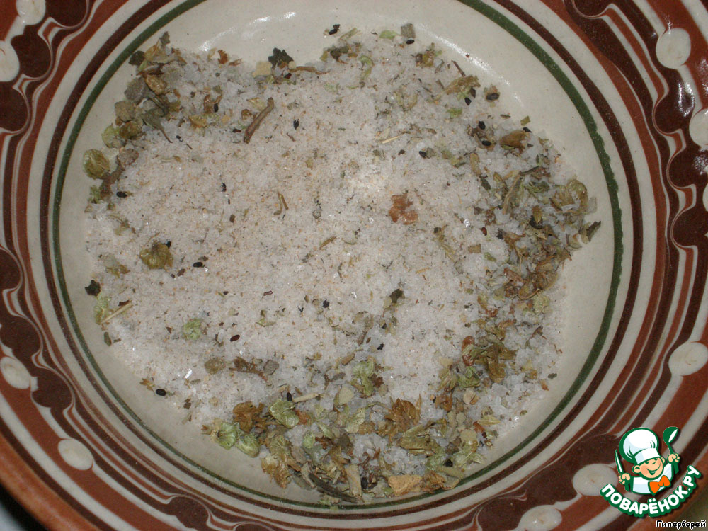 Сначала приготовим смесь приправ: смешаем соль, базилик, имбирь, шалфей и белый перец. Отставим в сторону, чтобы ингредиенты "напитались" ароматом.