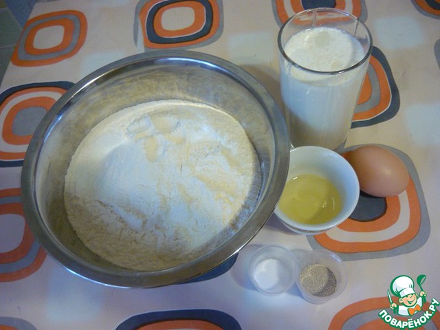 Для теста используем пшеничную муку, соль, сухие дрожжи, растительное масло, яйцо и молоко.