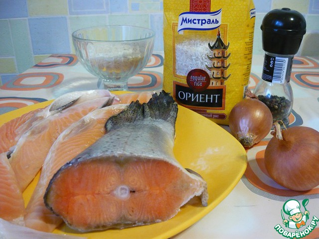 Для начинки берем брюшки лосося и хвостовую часть семги, лук, длиннозернистый рис, соль, черный молотый перец.