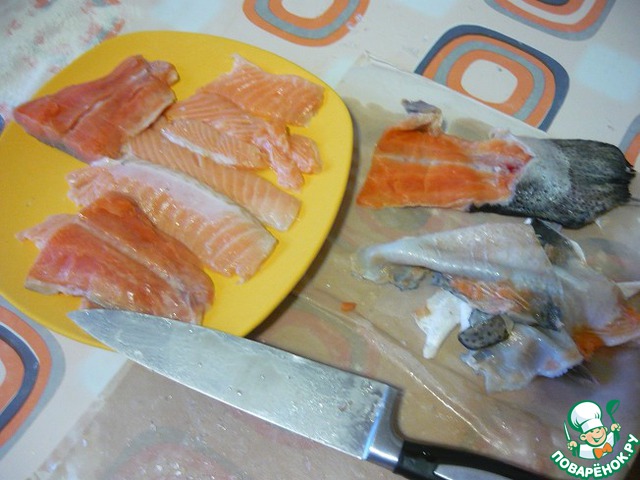 В это время чистим и моем рыбу. Я специально взяла хвостовую часть, т. к. одни только брюшки уж слишком жирные.