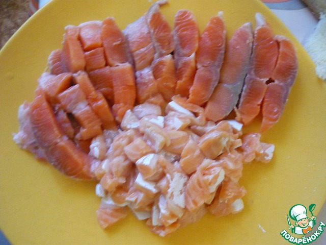 Теперь брюшки режим мелкими кубиками, а семгу брусочками толщиной 1 - 1,5 см. Вот такая красота...