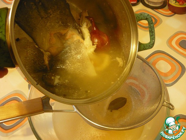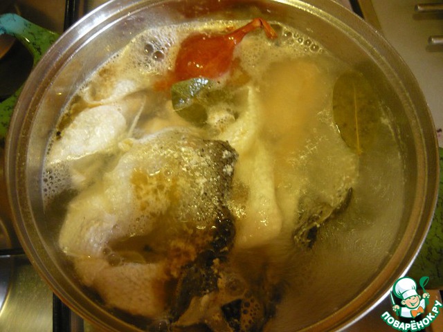 Пока тесто подходит, варим рыбный бульон из кожи и хребта. Берем эти обрезки, добавляем 3 горошины черного перца, головку репчатого лука, лавровый лист и заливаем всё 1,5 л холодной воды. Ждем, когда закипит, солим по вкусу и варим на медленном огне 20 минут, снимая пену.