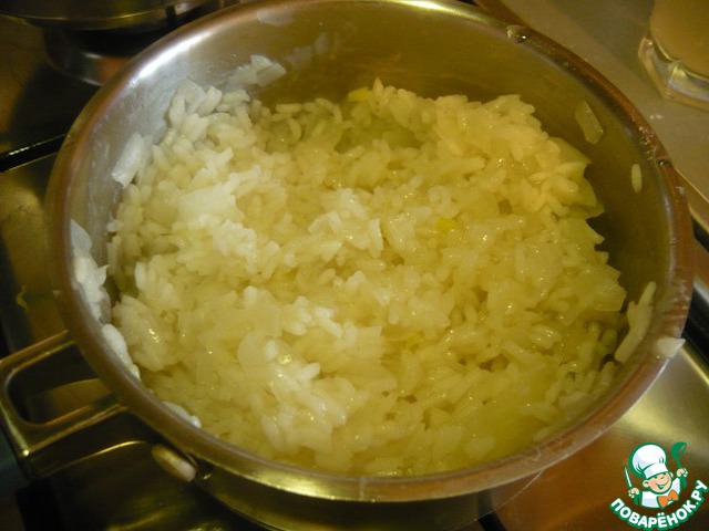 Рис высыпаем в кастрюльку, добавляем мелко нарезанный репчатый лук и 1,5 стаканами горячего бульона.