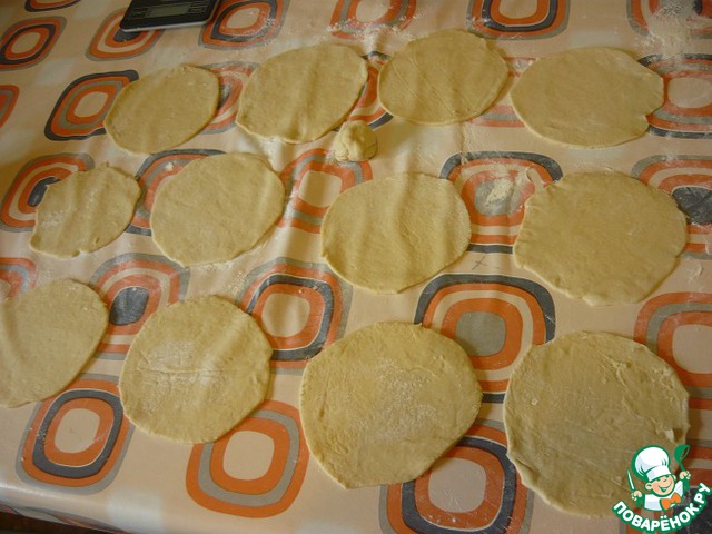 Раскатываем из этих 12 кусочков лепешки величиной с блюдце.