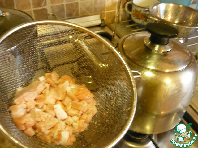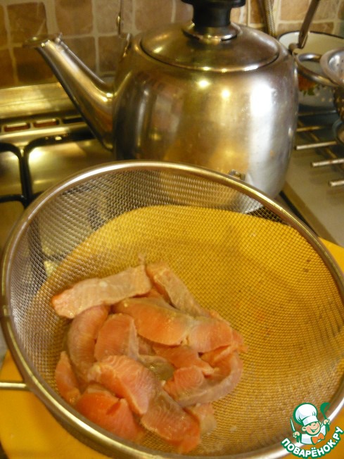 Берем мелкие кусочки лосося и ошпариваем их кипятком, чтобы в дальнейшем они быстрее приготовились.