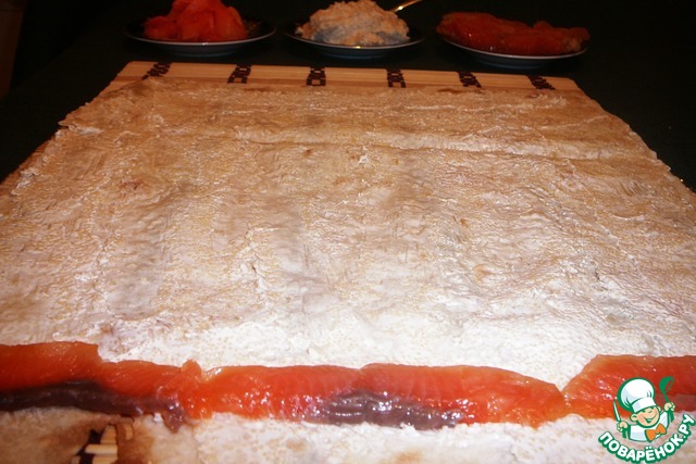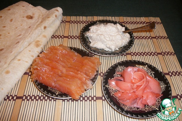 В качестве намазки я использовала "Икру мойвы с тунцом". Надеюсь никого не обижу, рассказывая как надо смазывать икрой лаваш, прокладывать дорожку из рыбы, заворачивать, затем еще дорожку из имбиря, опять заворачивать лаваш и т. д. и т. п. )))