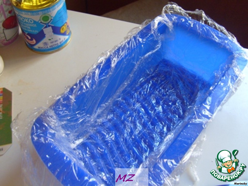 Положите на блюдо. Переверните ее вверх дном, уберите пленку. Украсьте по вашему вкусу и предпочтению