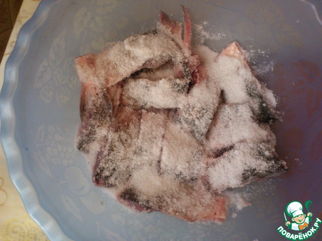 Засыпаем обильно солью с двух сторон, оставляем на 2 часа, чтобы рыба хорошо просолилась.
