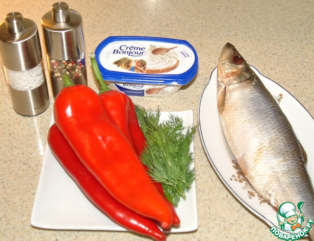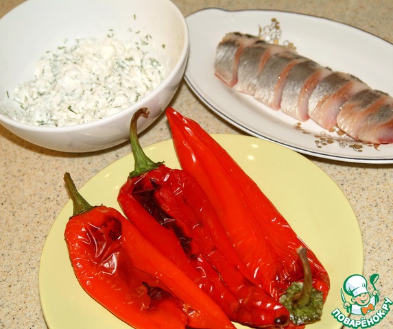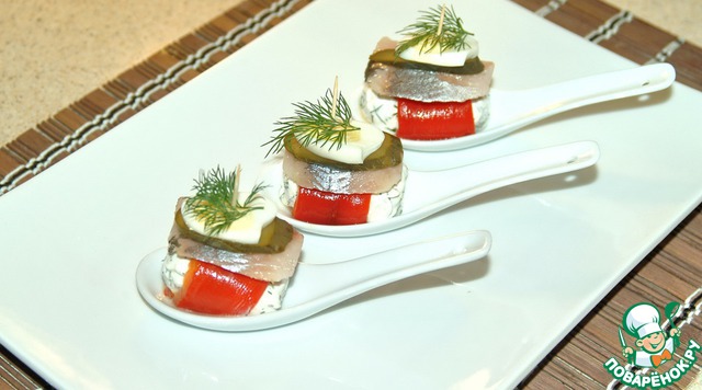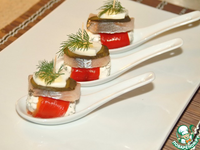 Закуска из творожного крема и сельди, с маринованным огурчиком и запеченным болгарским перцем