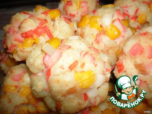 К батону добавить кукурузу и порубленные крабовые палочки.