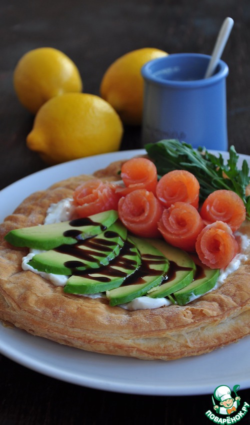 Остывший тарт смазать творожным кремом, на крем выложить лосося, авокадо и рукколу. Полить бальзамическим кремом.