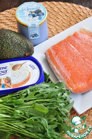 Творожный крем смешать с йогуртом, если необходимо, посолить, обязательно поперчить. Авокадо очистить от кожуры и косточки, нарезать тонкими полосками, сбрызнуть лимонным соком.