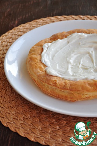 Тесто разморозить, присыпать мукой, раскатать. Вырезать круги размером с небольшое блюдо. Форму для запекания сбрызнуть водой, выложить тесто в форму. В середину теста выложить сухой горох, выпекать при 200* - 15 минут. Остудить.