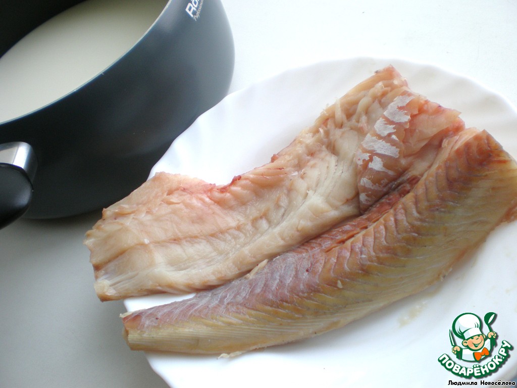 Взять одну рыбину, почистить, снять шкурку, удалить хребет. Филе рыбы отварить в молоке, добавив соль, луковицу, лавровый лист, перец горошком.