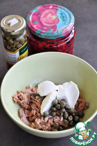 Вяленые томаты и анчоусы мелко нарезать. Смешать в пиале тунца (жидкость слить), каперсы, нарезанные томаты, филе анчоусов, творожный крем, пармезан. Поперчить черным молотым перцем, сбрызнуть соком лимона.