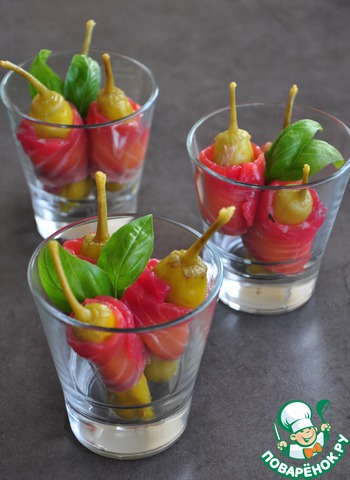 Перчики разрезать, нафаршировать тунцово-творожной массой. Завернуть в тонко нарезанные полоски слабосоленого лосося. Подавать в качестве закуски к крепким аперитивам. Особенно оценят эту закуску любители остренького.