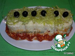 Смешиваем ингредиенты: рубленые яйца, измельчeнный перец, горошек, томатный сок, рыбу. Отвариваем рис и промываем холодной водой. Берeм формочку (у меня металлическая, если у Вас еe нет, просто - полоску картона сворачиваем в цилиндр, и закрепляем скотчем). На дно укладываем небольшое кол-во риса, смазываем майонезом, затем - слой приготовленной ранее смеси и далее продолжаем чередовать слои поочерeдно, не забыв смазывать каждый слой майонезом, до тех пор, пока не закончится рис. Блюдо готово. Украсить можно по Вашему желанию, очень красиво смотрится, если Вы на дно тарелки постелите цельные листья салата. Выставляю рецепт первый раз, не судите строго.