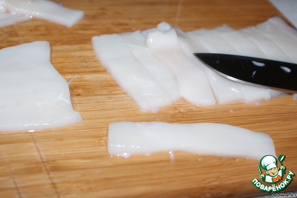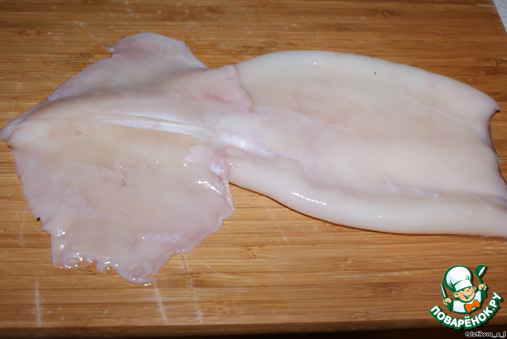 Кальмаров замочить в воде на 1 час, затем промыть, снять с них кожицу.