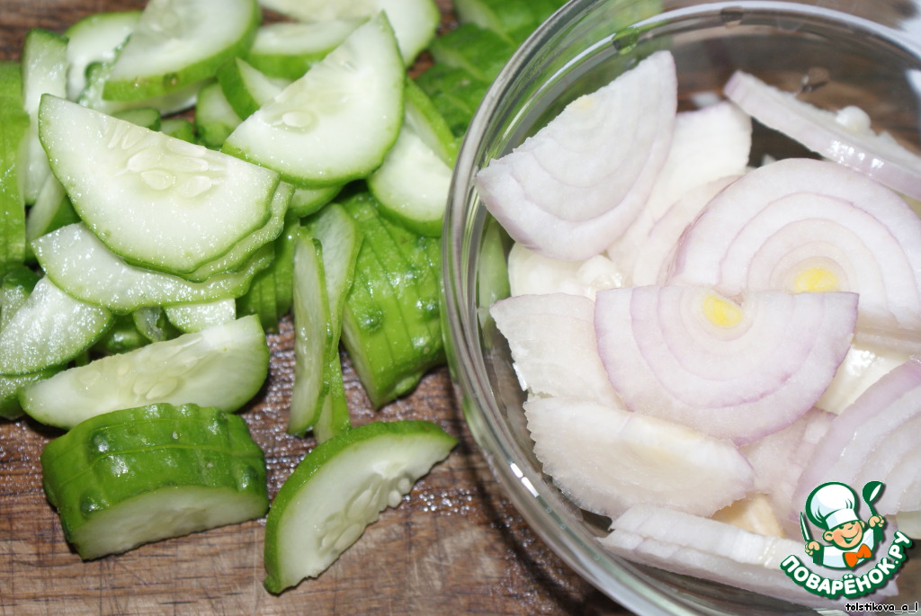 Нарезать огурец ломтиками, а лук полукольцами, измельчить чеснок.