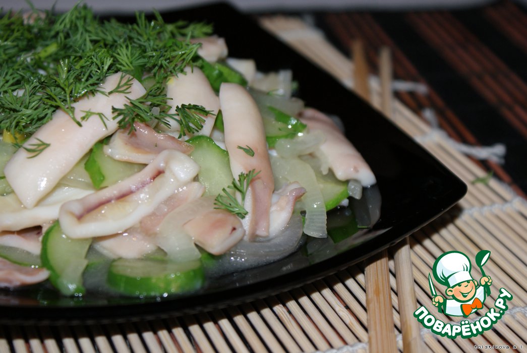 | Я к Вам с очень нежной, простой и вкусной закуской из кальмаров!!! Готовится всего за 15 минут и из минимум продуктов! Заходите, угощайтесь! Источник рецепта книга "Дары Нептуна" серии Семь Поварят. |