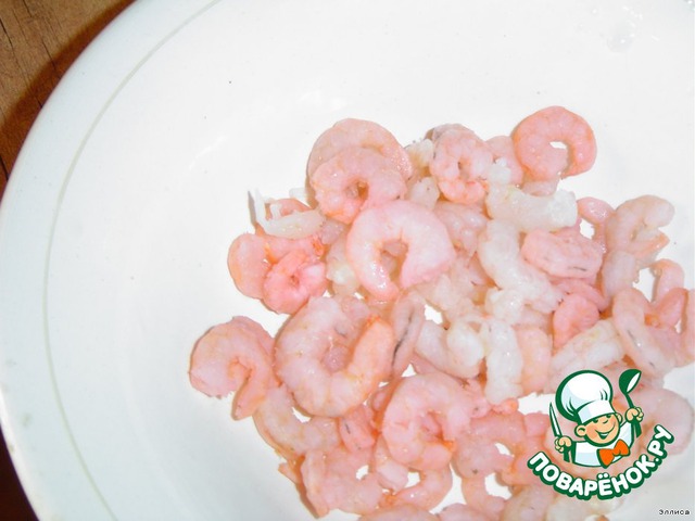 Размораживаем и очищаем креветки.