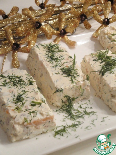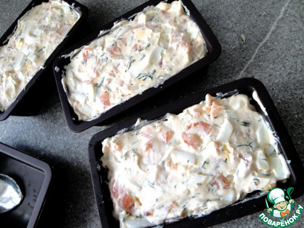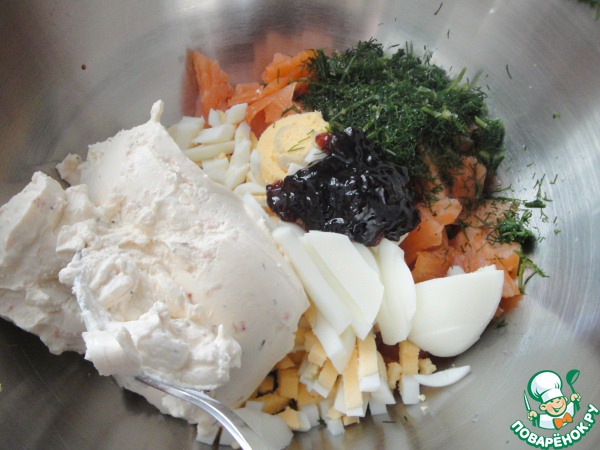 В чашке смешать сыр ( на этот раз у меня с перцем, так же очень вкусно с хреном), рыбу, яйца, укроп и желе. Если получится слишком густо добавьте чуть чуть сметаны.