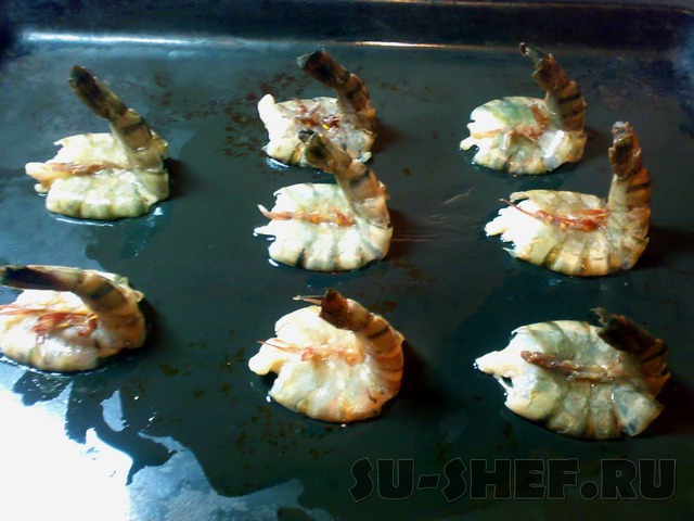 На смазанный противень выкладываем креветки, разрезами вниз и запекаем в духовке 5 минут.