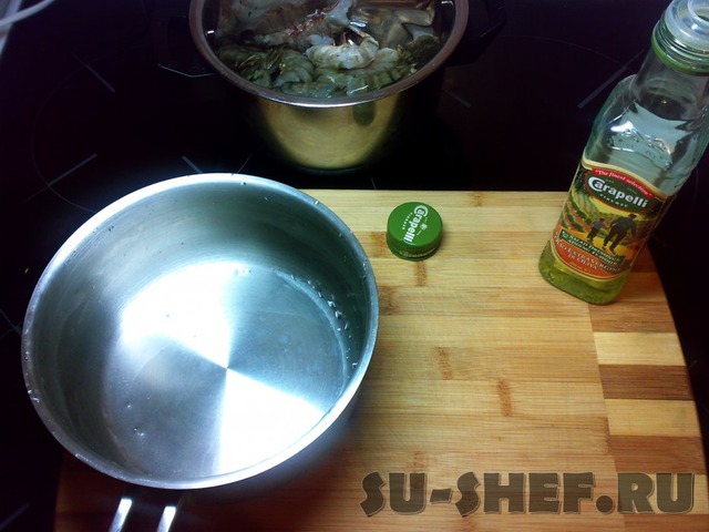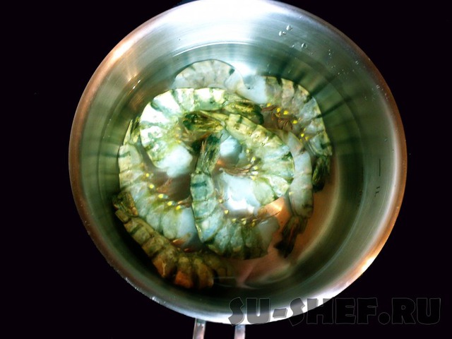 В небольшой сотейник с холодной водой погружаем мороженые креветки, на 10 минут.