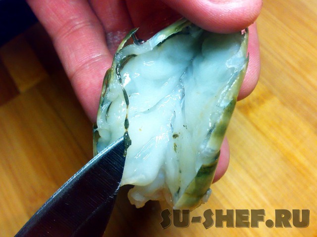 Разрезаем креветку вдоль спины (немного не дорезая до конца).