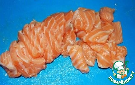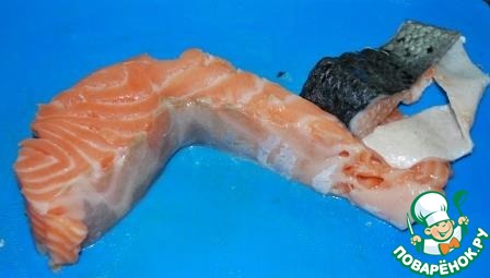 Берем вот такой красивый кусочек семги или форели. Наверняка можно использовать и другую красную рыбку, но я не пробовала.