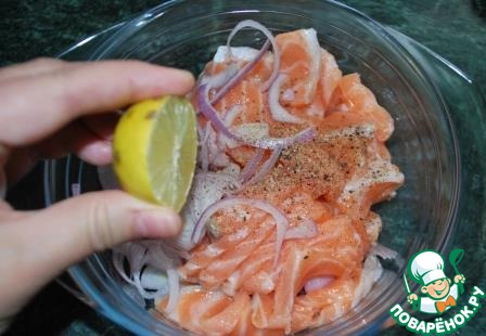 Смешиваем семгу с луком, добавляем свежемолотый черный перец, соль и сок лимона (у меня лайм). Хорошенько перемешиваем.