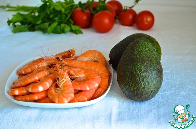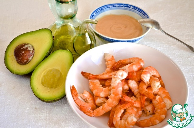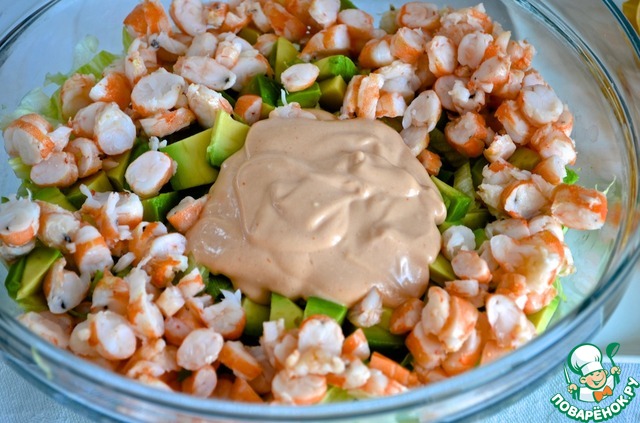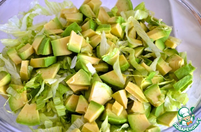 7. Салат айсберг нарезать тонкими полосками, авокадо на мелкие кубики. Если креветки большие, тоже порезать.
