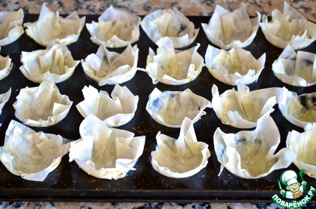 2. Смазать чашки формы для мини-кексов растопленным сливочным маслом и проложить каждую тремя слоями теста, располагая квадратики под разным углом.